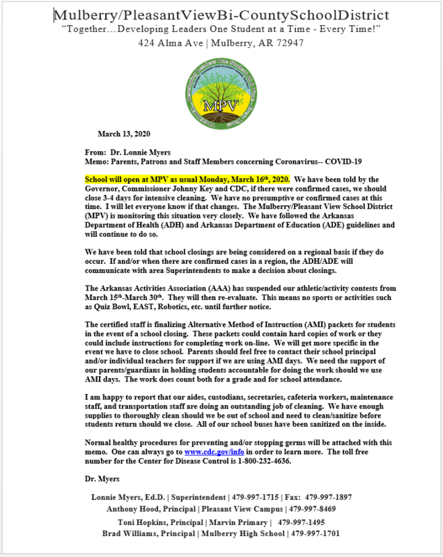 Letter from our Superintendent, Dr. Myers, regarding COVID-19
