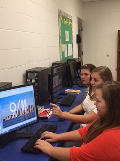 7th Graders: Beth Sluder, Haylee Whitson, and Alivia Owens work on their English/Social Studies project on 9/14. Students are studying the terrorist attack and creating presentations for English and Social Studies classes.